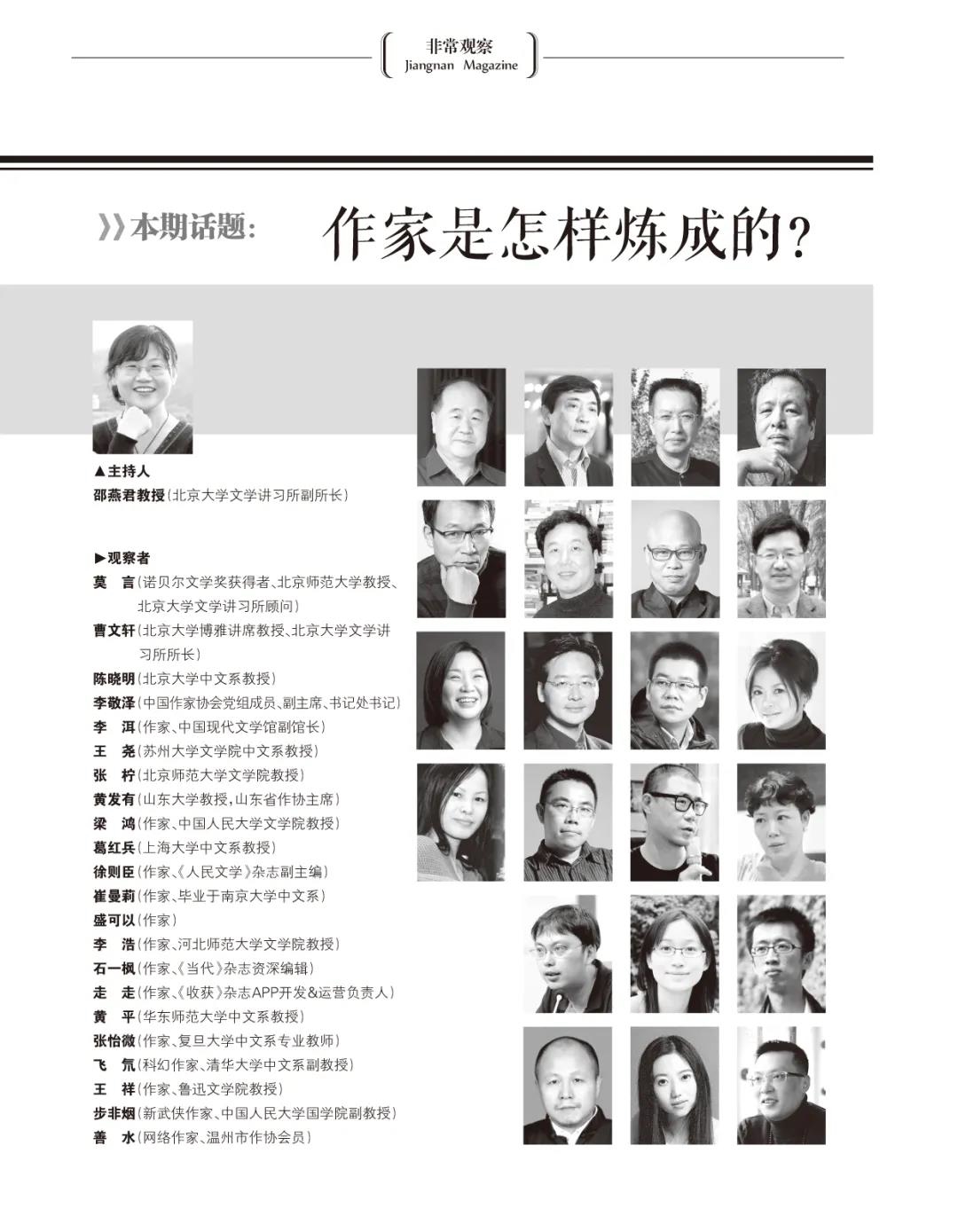 作家是天生的嗎?作家可以培養嗎?文學是可以教的嗎?作家是怎樣煉成的?上世紀流傳的說法是:中文系不培養作家。事實也是如此,無論中國還是國外,很多作家都不是文學專業出身,有的甚至大學都沒上過。然而在國外,很多大學早已開設以教授文學創作為主的創意寫作學院或者寫作課程。新世紀以來,復旦大學、中國人民大學、清華大學等高校相繼設立了創意寫作學院。2021年,北京大學成立了文學講習所。無論是創意寫作學院還是文學講習所,似乎都是奔著培養作家的目標而來……本期非常觀察由北大文學講習所和《江南》雜志聯合發起,邵燕君教授主持。邵燕君教授邀請了莫言、李敬澤等相關人士,就相關話題展開探討。