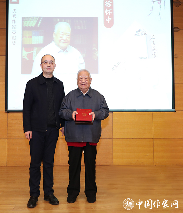 吳義勤為優秀作家貢獻獎獲得者徐懷中先生頒獎