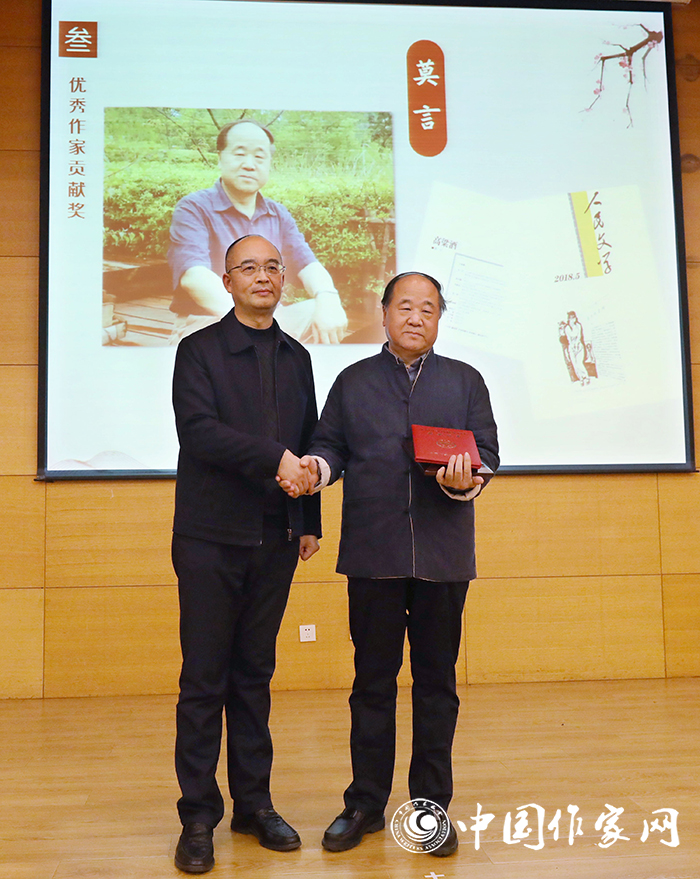 吳義勤為優秀作家貢獻獎獲得者莫言先生頒獎