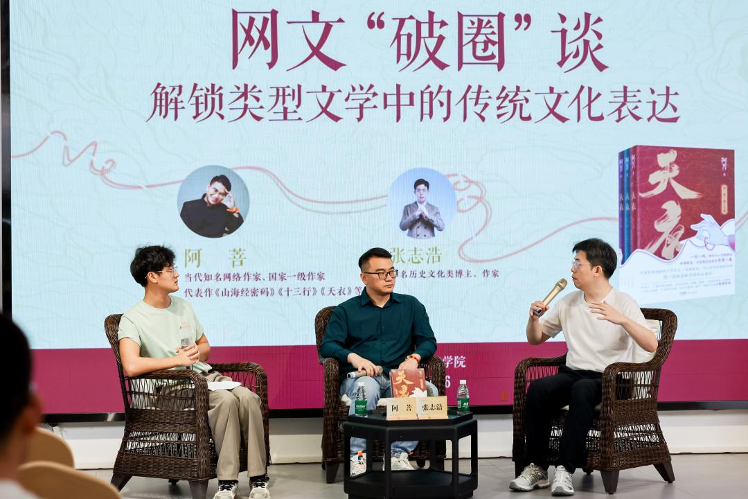 8月16日、17日下午,百萬暢銷書《山海經密碼》作者阿菩攜新書《天衣》,與B站百萬博主張志浩、阿排,分別以“網文‘破圈’談”和“拆解爆款網文邏輯”為話題,暢聊網絡文學與當下的大眾閱讀。