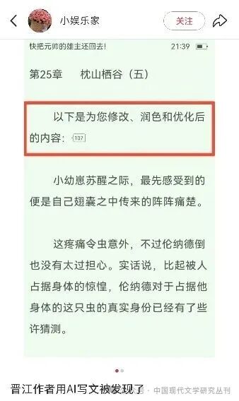 隨著大量AI生成作品的涌入,網絡文學場域的張力隨之被注入新的意義內涵。一方面,或許讓·鮑德里亞早已為我們敲響了警鐘:“我們生活在一個信息越來越多,而意義卻越來越少的世界里。”[12]利用人工智能大規模“水文”所帶來的內容生態膨脹,使得各個網文平臺的作品“量”雖能迅速堆積,“質”卻未必能與之齊頭并進,大量同質化文本的涌現可能反而遮蔽了真正具有表達力與思想性的優秀作品。晉江文學城、起點中文網等老牌網絡文學網站,雖有心進行防控,但面對投稿數量的指數級激增,現有的審核與篩選手段已顯捉襟見肘、防不勝防。晉江簽約作品《快把元帥的雄主還回去》的第25章“枕山棲谷”,其開篇竟明目張膽地保留了AI提示詞指令“以下是為您修改、潤色和優化后的內容”,引發讀者一片嘩然,目前該章節已被平臺鎖定。[13]起點中文網上同樣有例可循,其被收入精品頻道的小說《從小鎮做題家茍成大醫》(后更名為《醫療系學霸》)在第686章的結尾處,也出現了一段未被刪除的AI潤色指令。[14]除去這類“原汁原味”的AI生成痕跡以外,不少作品字里行間留下半遮半掩的“AI痕跡”。以晉江上架于2025年3月的簽約作品《予你心安》為例,文中主角徐以安將“馬克杯”摔進醫療廢物箱后,卻產生了“滿地青花瓷碎片”,隨后她又撿起地上的“玻璃”,物品材質的矛盾明顯暴露出敘事邏輯的斷裂,這種常識性的錯誤恰恰是算法“抽卡”式寫作缺乏具身認知的典型表現。“劣幣驅逐良幣”的殘酷局面在番茄平臺顯現得尤為清晰。同樣以番茄平臺3月1日的首秀作品為例,“據網文大數據,該期首秀中在讀漲幅超10萬的作品僅29本,在讀漲幅超30萬的‘爆款’為0。與之相對的是2月1日1569本新書首秀中,31本作品在讀漲幅超10萬,亦有4本在讀漲幅超30萬”[15]。可見,AI介入之下網文的規模性涌入并未帶來“爆款”的增長,反而使得真正有潛力的作品被大量平庸文本所淹沒。更令人憂慮的是,AI寫作的普及也使得“文本剽竊”出現了新的形態。早在2021年3月,就已有業內人士表示,“有的作者利用自動寫作軟件,將大量已有作品的文字內容復制拼湊到自己的小說中,再通過對他人作品進行語序調整、同義詞替換等表達方式的轉換,實現‘洗稿’”[16]。