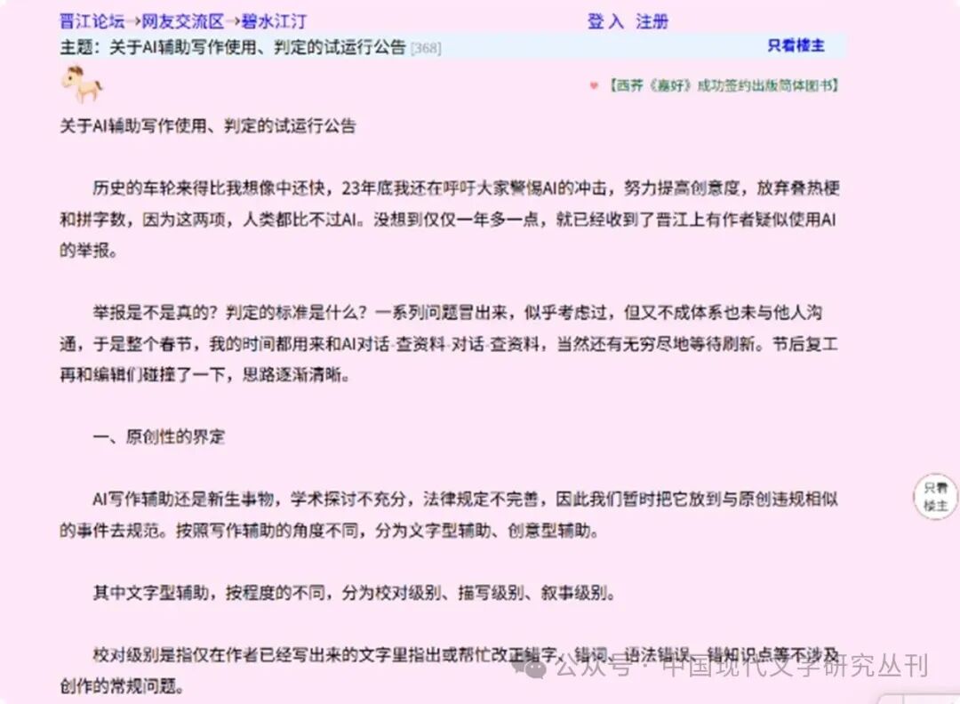 隨著人工智能文本生成的技術逐漸走向成熟,一種新的“創作規范”正在形成。各方均期待通過某種方式,重新建立對“人寫的”和“AI寫的”的辨識體系,以捍衛文學的合法性與人類作者的主體尊嚴。對于各個網絡文學平臺而言,在AI輔助寫作工具的推廣與內容規范的制定之間,始終存在難以調和的張力。一部分平臺向創作者開放AI寫作輔助功能,同時又在內容審核中嚴令禁止AI生成,而更多的網文平臺對AI持審慎或排斥的態度。