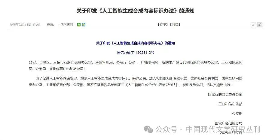 中國網信網發布《關于印發〈人工智能生成合成內容標識辦法〉的通知》