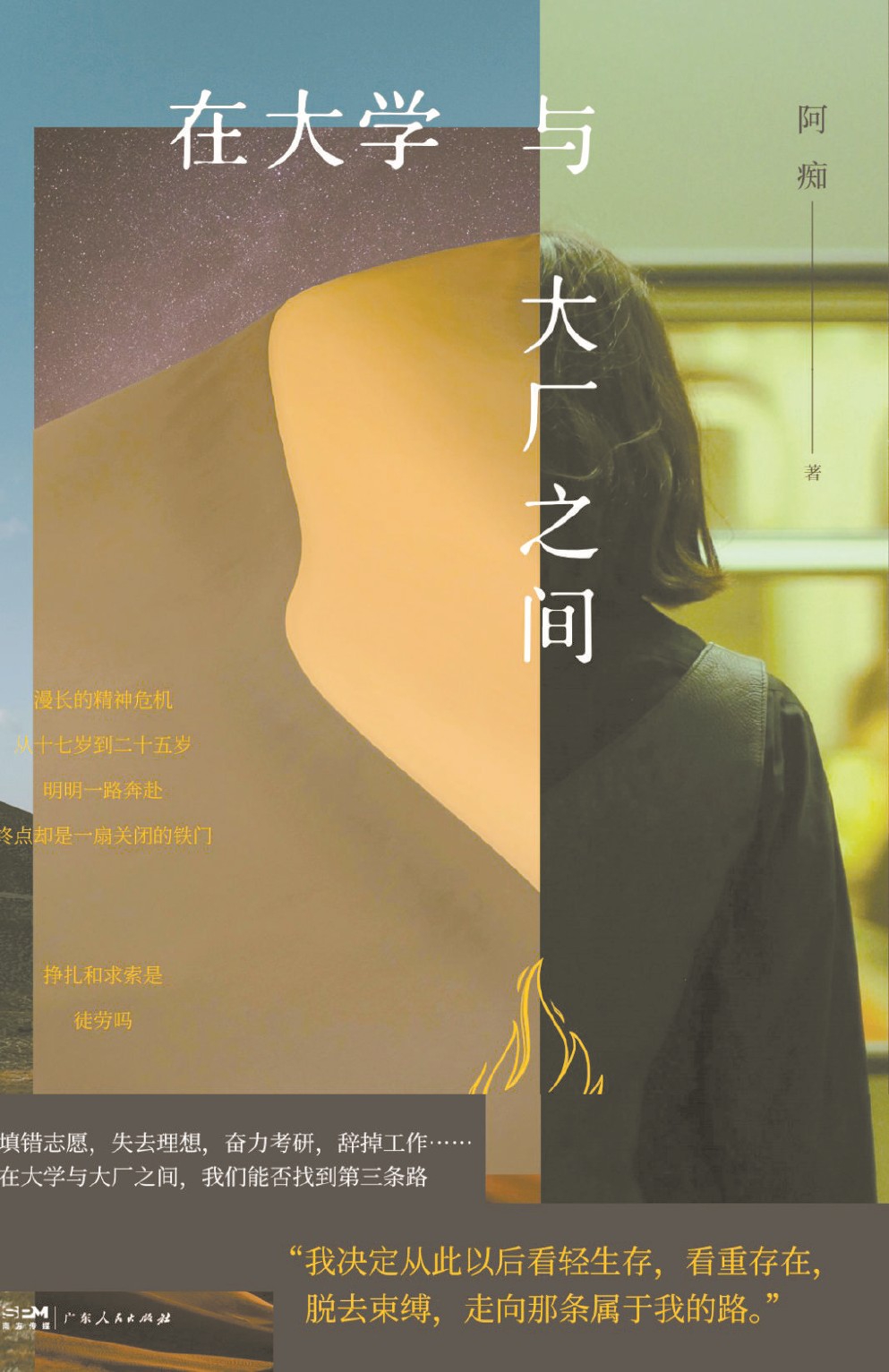 阿癡,鋼城的女兒,她心中藏有一個酒泉“沙漠觀測站”守站員的隱秘夢想。目前共出版了兩本書。在非虛構新作《在大學與大廠之間》中,她以自身從高考失利、努力考研到辭去大廠工作的真實經歷為藍本,寫下了這個時代里無數相似的普通青年在初入社會、長大成人的路上所面對的那些迷惘著的人生課題,并努力探索一個年輕人的精神危機該如何度過。