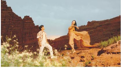 歌舞在影片中的運用對塑造人物、推動劇情發展起到了畫龍點睛的作用。市民與游客共舞的場景體現了民族舞蹈的開放、靈動、熱情,而萊麗在旅拍中裹著紅紗與金色披巾的旋轉鏡頭,用浪漫夸張的手法渲染了蔚藍的湖水、紅色的沙漠、潔白的雪山,主創借舞蹈展示山河美景,凸顯出新疆山水的人文之美。