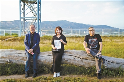評論家孟繁華(左一)、興安(右一)與《草原十二騎手》 主編阿霞(中)在敕勒川草原為新刊拍片