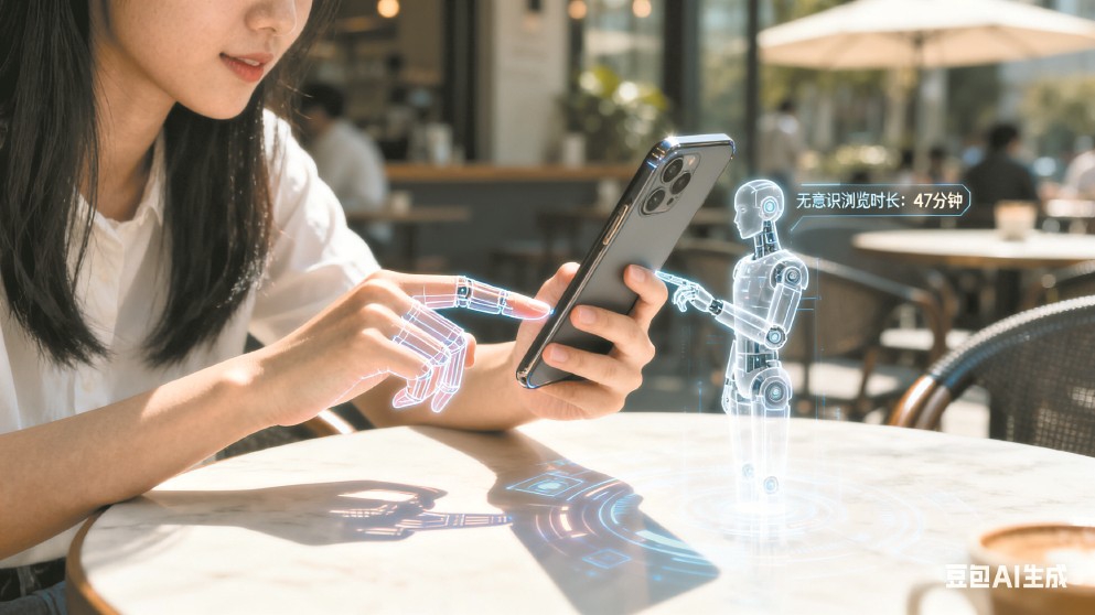 拿起手機刷刷社媒、短視頻,因技術發展而“無需思考”的行為成為日常,人和技術已很難分離。圖為AI制圖。 (人工智能生成)