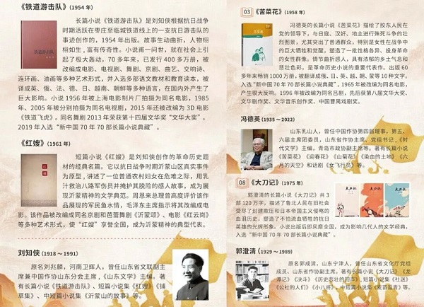 社會主義革命和建設(shè)時期,山東抗戰(zhàn)文學(xué)抒寫歷史記憶的文學(xué)重構(gòu)。劉知俠穿越敵人封鎖線深入魯南,和游擊隊員一起戰(zhàn)斗和生活,搜集了大量創(chuàng)作素材,推出長篇小說《鐵道游擊隊》。70多年來,已發(fā)行400多萬冊,被改編成電影、電視劇、舞劇、京劇、曲藝、交響詩、連環(huán)畫、油畫等多種藝術(shù)形式,并入選多部語文教材和教育讀本,被譯成英、俄、法、德、日、越南、朝鮮等多種語言,在國內(nèi)外產(chǎn)生巨大影響。馮德英的長篇小說《苦菜花》是革命小說的重要代表作,1956年被改編為同名電影,1996年被改編為同名呂劇,先后獲第八屆文華大獎、文華劇作獎、文化音樂創(chuàng)作獎、中國曹禺戲劇獎。郭澄清的長篇小說《大刀記》出版后即風(fēng)靡全國,成為影響一代人的紅色經(jīng)典。這3部作品2019年同時入選“新中國70年70部長篇小說典藏”。邱勛的中篇小說《微山湖上》獲1980年第二次全國少年兒童文藝創(chuàng)作評獎二等獎。李心田的中篇小說《兩個小八路》2018年被列入中宣部“優(yōu)秀青少年讀物工程”推薦書單。還有翟永瑚的小說《民兵爆炸隊》,賽時禮的小說《三進山城》、峻青的小說《馬石山上》等一大批優(yōu)秀作品,描繪了一幅波瀾壯闊的齊魯大地軍民浴血抗戰(zhàn)的全景圖,展現(xiàn)了抗戰(zhàn)時期山東人民的英雄氣概與家國情懷。