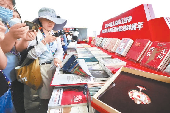 紀念中國人民抗日戰爭暨世界反法西斯戰爭勝利80周年專臺呈現了《烈火芳菲》等圖書,并有紀念郵票一同發行。 北京日報記者 程功攝