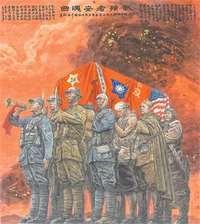 為了形式與內(nèi)容的統(tǒng)一,我從國際視野回顧、表現(xiàn)中國人民抗日戰(zhàn)爭和世界反法西斯戰(zhàn)爭的奮斗歷程。抗戰(zhàn)時(shí)期,有國共合作聯(lián)合抗日,有蘇聯(lián)紅軍、美國飛虎隊(duì)等支援中國抗日,很多軍人在這場戰(zhàn)爭中殉難。在畫面上,吹號者、持槍敬禮者、抬棺者共同組成莊重的儀式結(jié)構(gòu),他們中不僅有八路軍、新四軍,包括游擊隊(duì)、武工隊(duì),還有國民黨軍、蘇聯(lián)紅軍、美國飛虎隊(duì)。其中,走在最前列的是一名吹號的八路軍戰(zhàn)士,象征著中國共產(chǎn)黨在抗日戰(zhàn)爭中的中流砥柱作用;其后兩名軍人行軍禮,再后面的人抬棺槨,棺槨鋪展來自這幾方面力量的旗幟,以示對他們所作貢獻(xiàn)的深深敬意。
