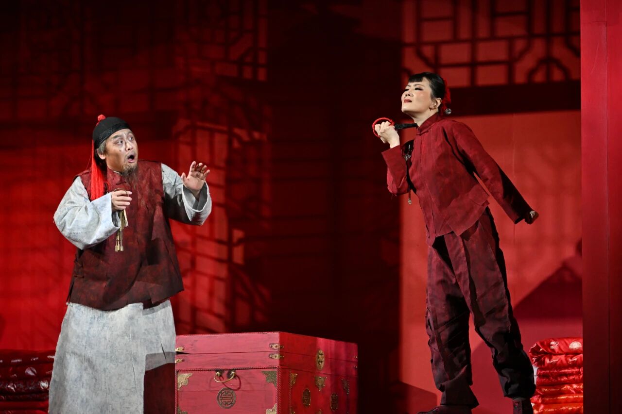 小說的線性敘事難以展現視覺與音樂切換所產生的巨大張力,而這正是歌劇藝術的魅力所在。在第二場中,一座精雕細琢的中式婚床成為舞臺核心,九兒身披紅嫁衣,靜坐于血色光影中,周遭的紅燈籠、錦緞鋪蓋,共同構筑起一個華麗而壓抑的封建牢籠。當患有肺癆的單扁郎踉蹌闖入,在婚床上展開一場追逐時,戲劇的荒誕感油然而生。他唱腔滑稽,強調“姻緣天定”;九兒的回擊則如驚雷,唱出“寧死不嫁漢奸”的決絕。二人風格迥異的唱段形成尖銳對抗:單扁郎的唱腔帶著俚俗的狡黠,九兒的反擊則如山崩地裂。于是,婚床化身“戲臺”,上演著一場被圍觀的儀式。這種“臺中臺”的嵌套設計,極大地濃縮了沖突,讓個體的反抗在與環境、命運的對抗中,迸發出悲劇性的崇高感。更加震撼人心的,是緊隨其后的場景切換:舞臺從壓抑可怖的婚床轉變為無邊的高粱地。余占鰲與九兒在此深情重唱,那簡單的問答“這里就是家”,與先前場面形成天壤之別。情感如野火般掙脫所有束縛,使這片高粱地化作一場對生命、自由與愛最直接、最熱烈的禮贊。