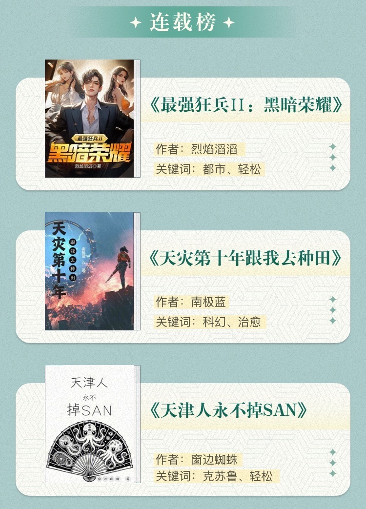 連載榜的三部作品,憑借新穎有趣的題材持續(xù)獲得廣泛關(guān)注。《最強(qiáng)狂兵Ⅱ:黑暗榮耀》作為經(jīng)典男頻網(wǎng)文《最強(qiáng)狂兵》的續(xù)作,延續(xù)前作構(gòu)建的世界觀(guān),將家族復(fù)興的主題與都市異能結(jié)合,并融入許多新興勢(shì)力,成功拓展了題材邊界,為類(lèi)型創(chuàng)作注入了新鮮活力。《天災(zāi)第十年跟我去種田》立足末日語(yǔ)境,主角夏青于文明傾覆十年后開(kāi)啟破局之旅——以農(nóng)業(yè)為根基復(fù)蘇生產(chǎn)力,以社群為紐帶重建社會(huì)契約,在廢墟之上踐行人類(lèi)文明的延續(xù)使命。《天津人永不掉SAN》以克蘇魯為題材,將西方恐怖敘事與天津地域文化成功結(jié)合,將克蘇魯風(fēng)格實(shí)現(xiàn)了本土化改造。
