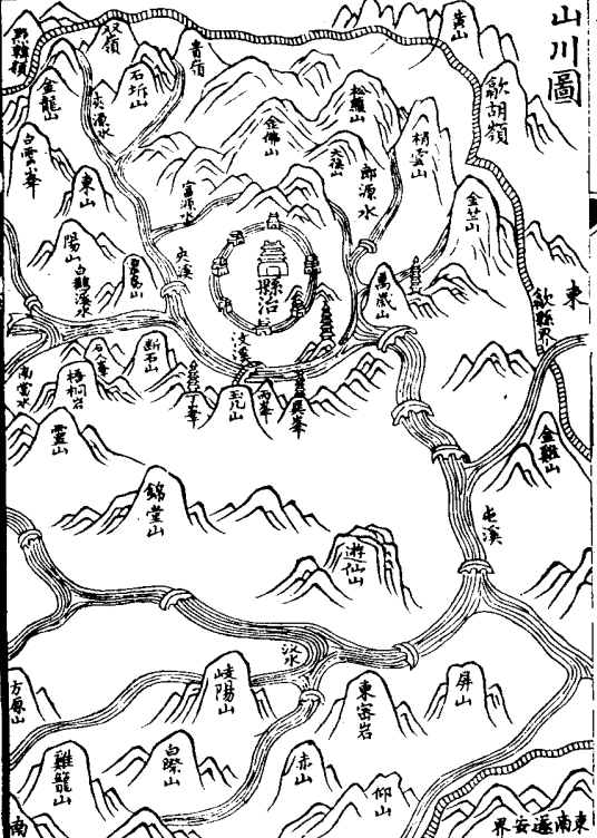 根據(jù)《休寧縣志》中的區(qū)域圖來看,休寧縣城區(qū)之外由東南至東北共有三座塔狀建筑物,文中所言“四都”即在城區(qū)正東方塔東側(cè),對照來看即是萬歲山東方的“金竺山”腳下。也就是說,金聲及《休寧縣志》中所稱“甌山”很有可能便是“金竺山”或“金竺山”中某支脈。
