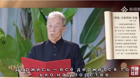 活動現場還特別播放了王蒙先生朗誦其作品選段《堅持,我們全靠堅持!》的視頻。視頻中,年逾九旬的王蒙先生依舊精神矍鑠,用慷慨激昂、中氣十足的語調朗誦到:“我們多么幸福,我們多么精彩,我們如日中天,我們繼續堅持,我們再堅持奮斗百年千載不停息!”。激昂的文字與真摯的情感感染了在場的年輕讀者,現場響起了經久不息的掌聲。