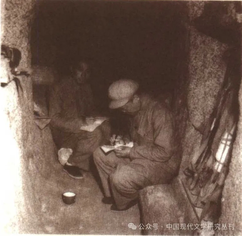 我在床上想著陣地生活,聽見土落下的聲音,聽見滴水濺水的聲音,也想到洞子塌下的事,想到自己的家的時候也有,但更多想到戰士的生活,對戰士的心情好像有了更深的體會。到十二點以后才睡著。[81]