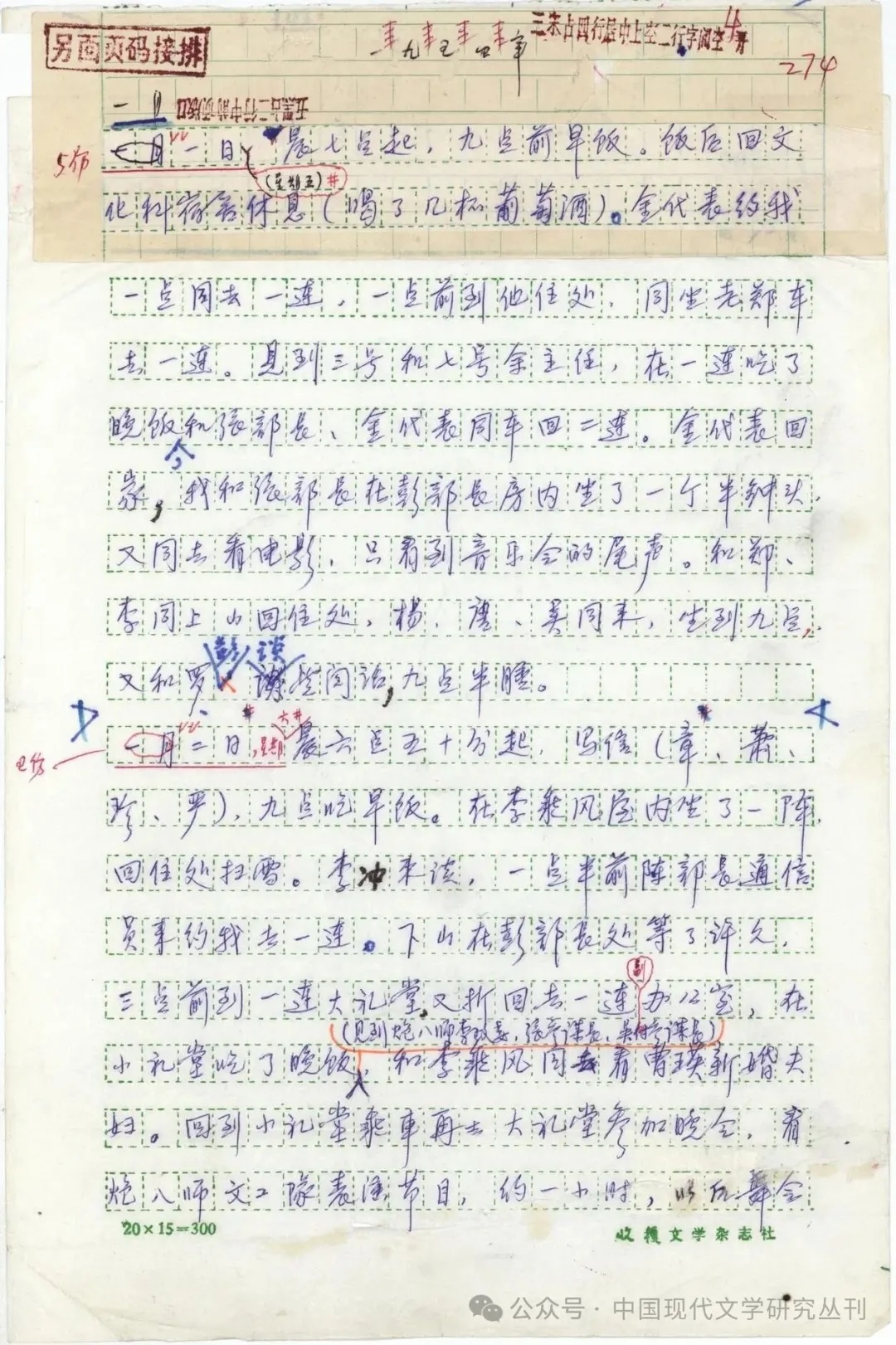 (二)抄件/抄稿本。抄稿本系方便日記文稿的編輯排版,巴金安排助手根據日記手稿原文抄錄所成,使用方格文稿紙單面抄寫,上有大量編校字跡和排版信息,并附頁碼和注釋文字?!陡俺沼洝罚ㄒ唬?,封面1頁,正文共196頁。根據抄錄的筆跡來看,應有兩人參與了抄錄工作,根據抄稿右上角機印頁碼,5~70頁和132~200頁為同一人用藍色圓珠筆抄錄,正文71~131頁為另一人用藍黑色鋼筆抄錄。《赴朝日記》(二),封面1頁,正文共78頁。根據筆跡來看,也有兩人參與抄錄工作,根據抄稿右上角機印頁碼,202~218頁由一人用藍色和黑色圓珠筆抄錄,219~279頁為另一人用藍色圓珠筆抄錄。根據抄稿本的筆跡推斷,應有多人(至少三人)參與了《赴朝日記》手稿的抄錄工作。
