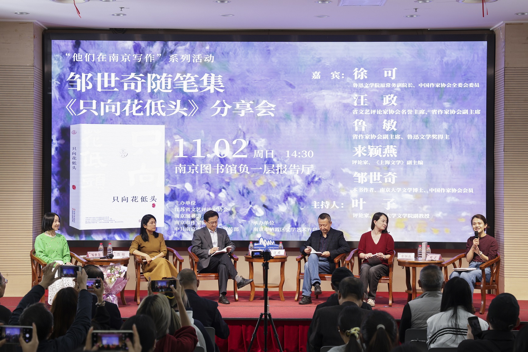 11月2日,江蘇省文藝評論家協會、南京市作家協會、中共南京市棲霞區委宣傳部主辦的青年作家鄒世奇隨筆集《只向花低頭》分享會在南京圖書館舉行。魯迅文學院原常務副院長、中國作家協會全委會委員徐可,江蘇省文藝評論家協會名譽主席、省作家協會副主席汪政,江蘇省作家協會副主席、作家魯敏,評論家、《上海文學》副主編來穎燕,本書作者、南京大學文學博士、中國作家協會會員鄒世奇參與分享,分享會由評論家、南京大學文學院副教授葉子主持。